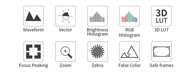* Mit Waveform, Vectorscope, RGB-Histogramm, Focus Assist, Monochrom usw. Funktionen, können Sie genau Belichtung und Fokus jede Aufnahme helfen.