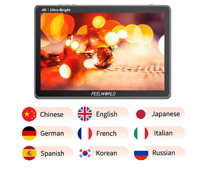Der Monitor ist mit 3 standardmäßigen 1/4"-Montagegewinden (unten, rechts, links) ausgestattet, so dass Sie ihn leicht an der Kamera oder anderen Geräten mit einem magischen Arm, einer Halterung usw. befestigen können. Erfüllt die verschiedenen Überwachungsanforderungen von Fotografen und Regisseuren.