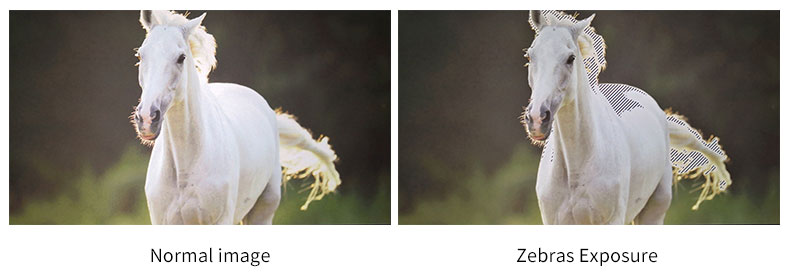 Die Belichtung wird als Hilfsmittel zur Einstellung der Belichtung im Zebramuster-Modus verwendet. Sie wird als überbelichtet angesehen und zeigt bewegliche Warnlinien im überbelichteten Bereich an. Es gibt einen Zebrawert im Bereich von 1-100%, der eingestellt werden kann.