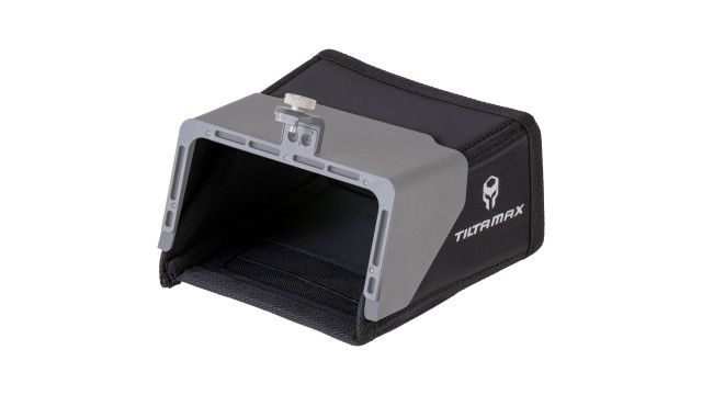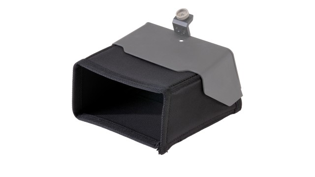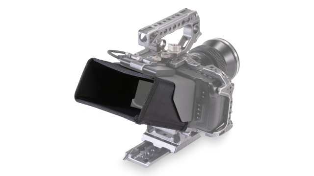 Die vollständige Sonnenblende kann mit den mitgelieferten Klettverschlüssen an der partiellen Sonnenblende für BMPCC 4K befestigt werden. Dadurch erhalten Sie eine größere Abdeckung des Sonnenschutzes. Ein Fach an der Unterseite der vollständigen Sonnenblende kann geöffnet werden, um den Zugriff auf den Touchscreen der Kamera zu ermöglichen.