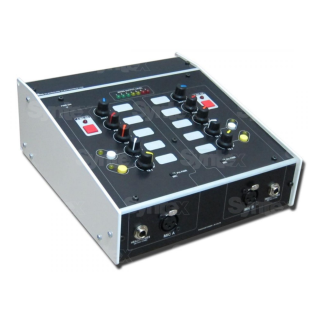 Auf der Vorderseite befinden sich zwei Mikrofoneingänge mit 48-V-Phantomspeisung. Jeder Mikrofoneingang hat einen eigenen statischen Ausgang, außerdem gibt es einen Ausgang mit gemischten Eingängen beider Mikrofoneingänge. Beide Talkback-Schaltungen haben separate Ausgänge und sind für beide Kommentatoren gemeinsam. Es gibt vier Eingänge für externe Quellen und ein Sidetone-Potentiometer. Diese sind für jeden Kanal separat verfügbar, so dass jeder der beiden Kommentatoren den Eingangspegel an seine persönlichen Vorlieben anpassen kann. Für den Anschluss von Kopfhörern verfügt die Express Box über zwei 6,3 mm (1/4")-Ausgangsbuchsen. Zur Messung des Ausgangspegels verfügt die Express Box über eine 7-Segment-LED-PPM-Anzeige.