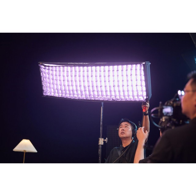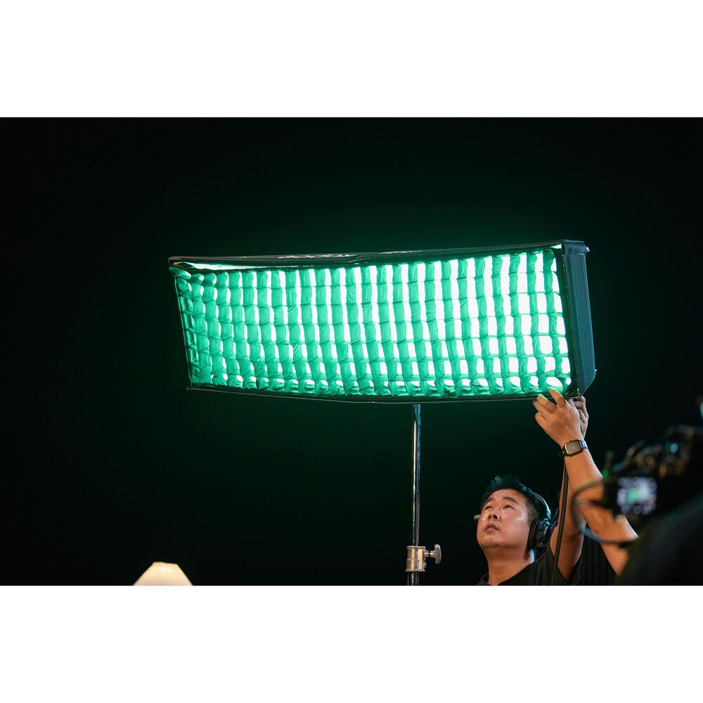 Das Kit enthält eine Softbox zur Lichtstreuung, eine Schwenkhalterung, einen Controller, ein Anschlusskabel, ein Netzkabel, einen Adapterhalter und eine Tragetasche und bietet eine einsatzbereite, flexible Beleuchtungslösung für eine Vielzahl von Produktionsanforderungen.