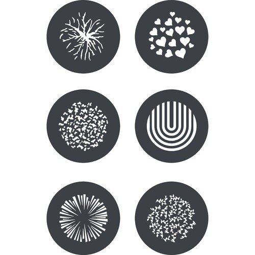 Erweitern Sie Ihren Godox MG1200Bi-Scheinwerfer mit dem GP-GS2-Gobo-Set, das sechs Stahl-Gobos enthält, die kreative Muster wie Feuerwerk, Sonnenstrahlen, Herzen und mehr projizieren – perfekt für Theater, Film, Mode und szenische Effekte.