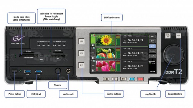 Die neuen Grass Valley T2 4K-Videorecorder/Player sind für Fernsehstudios oder Übertragungswagen konzipiert, die eine große Anzahl von Audio- und Videoformaten verarbeiten, einschließlich. SD, HD, UHD oder 4K DCI Standards. Sie kombinieren das Aussehen und die Funktionsweise klassischer Videorekorder mit moderner Touchscreen- oder App-Steuerung. Sie dienen nicht nur zum Laden von Material, sondern auch zur Wiedergabe, Verwaltung oder Archivierung von Videomaterial oder als Quelle für Video/Grafik für den Arbeitsplatz des Regisseurs. Eine spezielle Anwendung erleichtert die Auswahl von Medien oder die Erstellung von Wiedergabelisten und natürlich die Integration mit der EDIUS-Anwendung des Unternehmens zum Trimmen und Bearbeiten von Clips während der Aufnahme (Elite-Version)