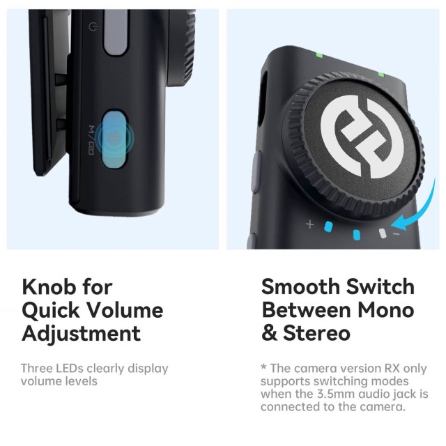 Das System zur Unterdrückung von Umgebungsgeräuschen sorgt für eine präzisere Klangwiedergabe in lauten Umgebungen. Der Benutzer kann den Grad der Unterdrückung leicht anpassen, um in jeder Situation die besten Ergebnisse zu erzielen. Das Mikrofon verwendet die Hollyland LarkSound App, die Firmware-Updates, Lautstärke- und Geräuschunterdrückungseinstellungen sowie die Steuerung des Betriebs in Echtzeit per Knopfdruck ermöglicht. Natürlich gibt es auch die Möglichkeit, die Videoaufnahme über mobile Geräte aus der Ferne auszulösen (durch doppeltes Drücken der Taste für die Geräuschunterdrückung), eine Taste für die schnelle Lautstärkeregelung oder das einfache Umschalten zwischen Mono- und Stereomodus.