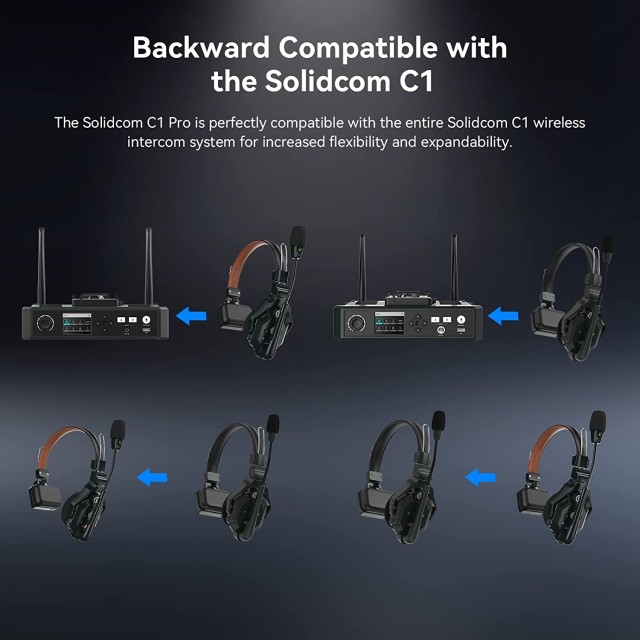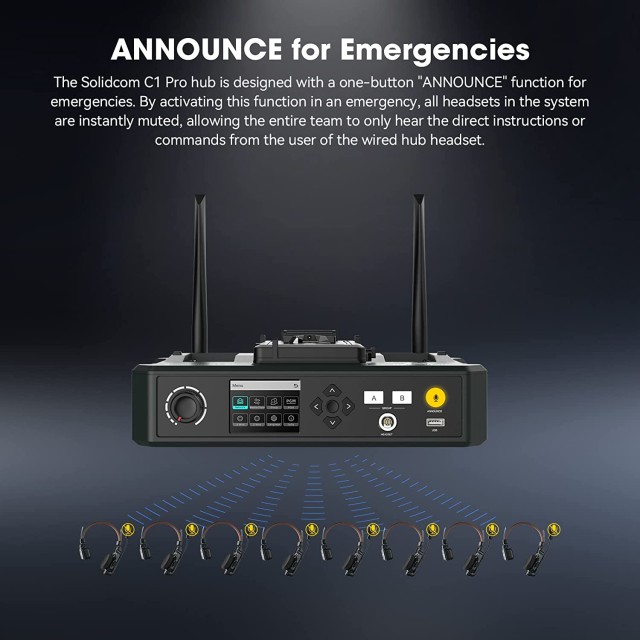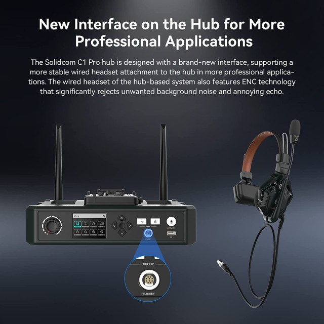 Das Hollyland Solidcom C1 Pro ist eine drahtlose Vollduplex-Sprechanlage im 1,9-GHz-Band (DECT 6.0) mit einer Reichweite von bis zu 350 m (Sichtverbindung). Durch die Integration aller Komponenten in das Headset bietet es maximalen Komfort und leichte Tragbarkeit, ohne zusätzliche Beltpacks oder Basisstationen. Das Headset wiegt ca. 170 g und wird mit einem Ersatzakku für einen ausfallfreien Dauerbetrieb geliefert. Das Solidcom C1 Pro Intercom bietet Audioübertragung im Frequenzbereich von 150 Hz - 7 kHz, AEC (Acoustic Echo Cancellation)-Technologie, Richtmikrofon zur Unterdrückung von Umgebungsgeräuschen, zusätzliches omnidirektionales Mikrofon zur Umgebungserkennung und Environmental Noise Cancellation (ENC; abschaltbar), Push-to-Talk-Betrieb, Übertragungsverschlüsselung, etc. Es ist in mehreren Varianten als Set für Teams von zwei bis sechs Personen erhältlich.