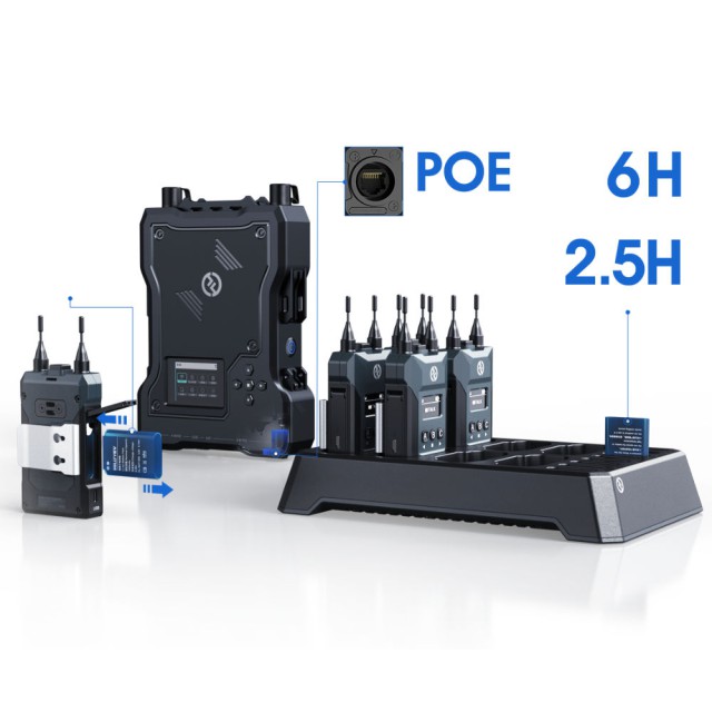 Die Verwaltung des M1-Systems ist sehr einfach: Wählen Sie einfach mehrere bestimmte Beltpacks aus und erstellen Sie eine Gruppe davon. Gruppen können nicht nur über die Basisstation, sondern auch über eine mobile App oder eine Website erstellt und verwaltet werden. Das System unterstützt bis zu drei Gruppen von Beltpacks ("Beleuchtungen", "Kamera", "Beschallung" usw.) für maximale Flexibilität bei der Verteilung am Arbeitsplatz. Die Basisstation kann dank einer Reihe von Schnittstellen auch problemlos mit anderen Audiogeräten verbunden werden: 2W (XLR), 4W (RJ-45) und PoE/LAN. Das Pairing der Beltpacks erfolgt direkt durch den Hersteller; kommen neue Beltpacks hinzu, erfolgt das Pairing durch Anschluss an die USB-Schnittstelle der Basisstation.