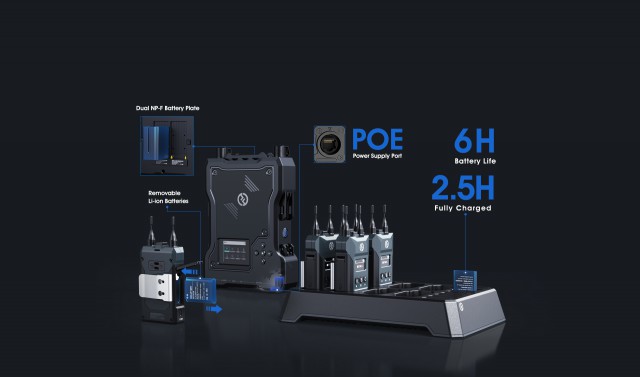Professionelle Headsets mit Lemo-Steckern sind im Lieferumfang enthalten, aber auch andere Headsets mit 3,5-mm-Steckern können an die Beltpacks angeschlossen werden. Interessant sind auch die beiden austauschbaren Li-Ionen-Akkus der Beltpacks, die separat in etwa 2,5 Stunden aufgeladen werden können und eine Laufzeit von bis zu 6 Stunden pro Akku ermöglichen.