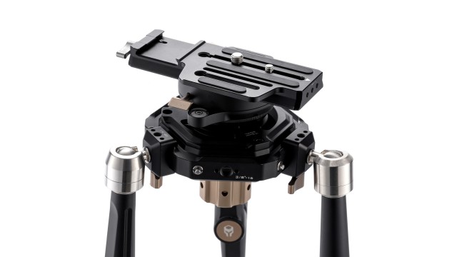 Der mitgelieferte Kopf unterstützt Arca- und Manfrotto-Schnellwechselplatten und ist somit mit spiegellosen und leichten Kinokameras mit oder ohne Käfig kompatibel.