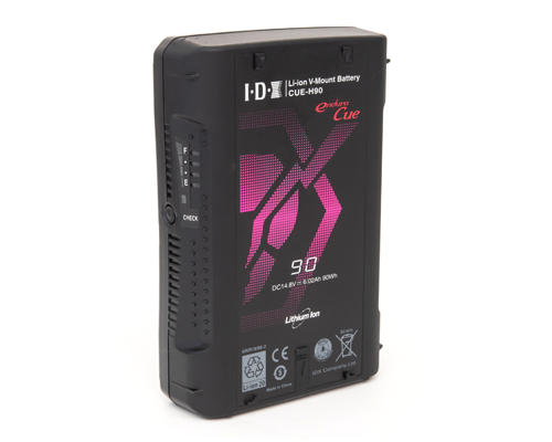 Der kompakte (97x146x39 mm, 610 g) IDX CUE-H90 V-Mount-Akku mit einer Kapazität von 90 Wh (14,8 V, 6,02 Ah) leistet bis zu 7A/85W und bietet außerdem einen 80W D-Tap-Ausgang (ungeregelt), eine Status-LED-Anzeige, hohe mechanische und elektrische Widerstandsfähigkeit und volle Kompatibilität mit ENDURA V-Mount-Zubehör und Ladegeräten.