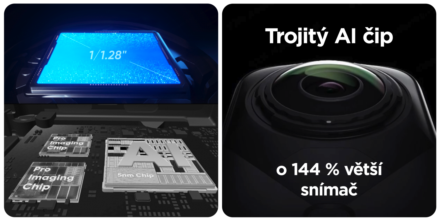 Action-360°-Kamera Insta360 X5 mit 1/1,28"-Sensor und Triple-AI-Chip. Auflösung von 360°-Videos bis zu 8K/30 fps, bei 4K bis zu 120 fps. Fotoauflösung 72 Mpx. Wasserdicht bis 15 m, 6-Achsen-Stabilisierung FlowState, Bitrate 180 Mbps, verbesserter Nachtmodus. Akku 2400 mAh mit einer Laufzeit von bis zu 185 Minuten. Bietet InstaFrame-Modus für sofortiges Teilen, verbesserten Ton mit neuem integrierten Windschutz. Verfügt über robuste und austauschbare Objektive. Abmessungen der Kamera: 46 x 124,5 x 38,2 mm. Im Lieferumfang enthalten sind ein unsichtbarer Selfie-Stick, eine 128 GB microSD-Speicherkarte, FlexiCare für 2 Jahre, eine Tragetasche, ein USB-C/C-Kabel, ein Reinigungstuch für die Objektive und Reinigungsaufkleber.