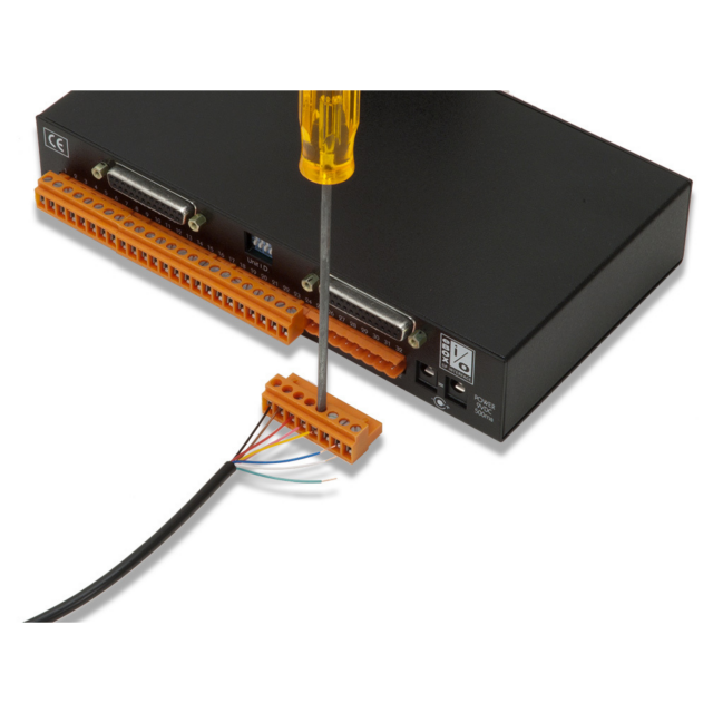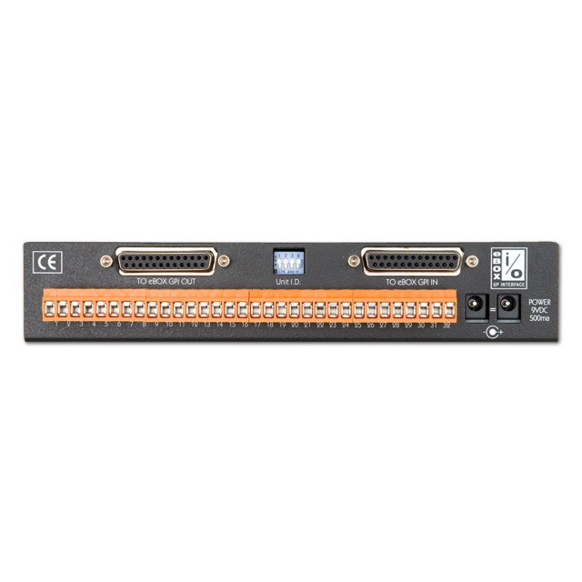 Alle Anschlüsse werden auf der Rückseite über hochdichte Schraubklemmen vorgenommen. Bis zu 3 eBOX io können kaskadiert werden, um alle 24 eBOX GPI-Ein- und Ausgänge umzuwandeln. LEDs auf der Vorderseite zeigen den Signalstatus an und erleichtern die Fehlersuche. Die eBOX io ist eine halbe Rack-Einheit, die neben einer eBOX in einem einzigen Rack Platz findet.