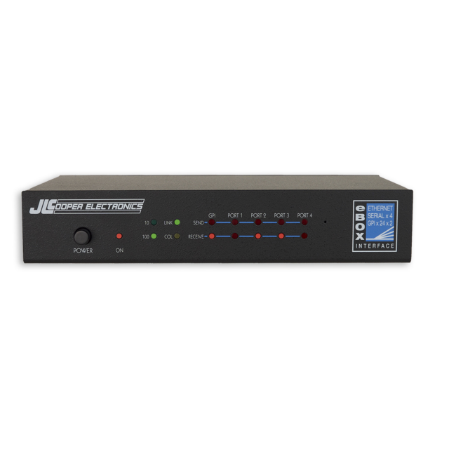 Die eBOX von JL Cooper ist ein Gerät, das als Portal für die Steuerung von Geräten in Ihrer Einrichtung oder auf der ganzen Welt dient. Sie beseitigt Informationsengpässe und überwindet Entfernungsbeschränkungen, die typischerweise mit der seriellen Kommunikation einhergehen.