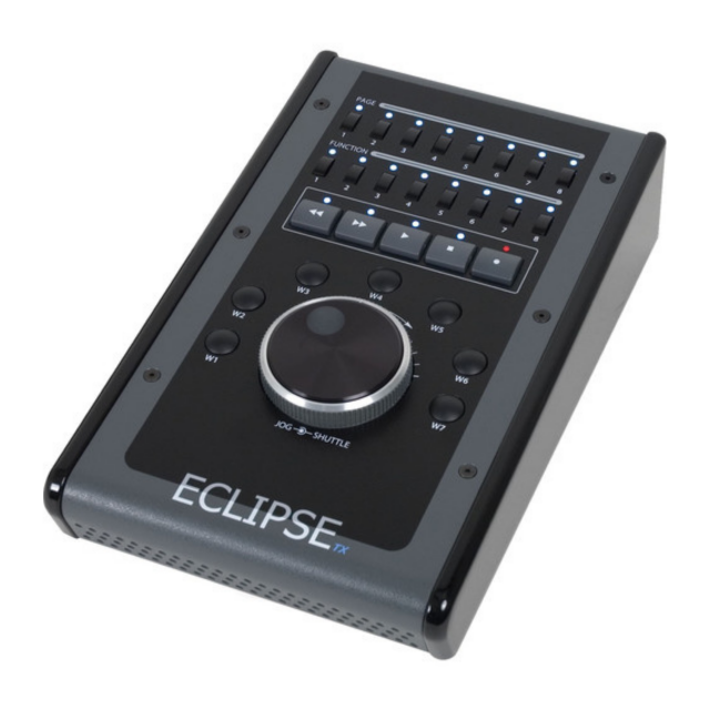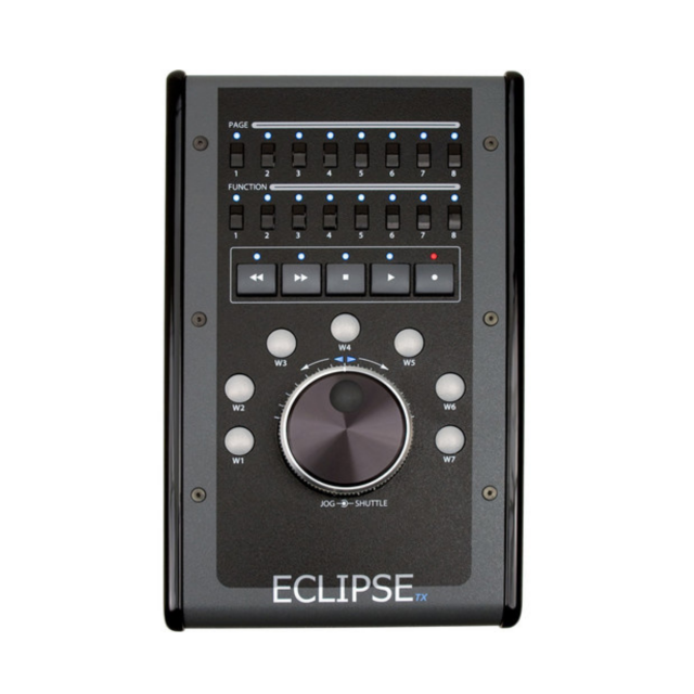 Der JL Cooper Eclipse TX Midnight Compact Transport Controller ist eine taktile Steuerungsoberfläche, die für Videoschnittanwendungen wie Apple Color und Final Cut Studio entwickelt wurde. Er ist für den Betrieb mit dem Eclipse SX Midnight vorgesehen, um die Transportsteuerung des Geräts zu erweitern. Der Eclipse TX Midnight erweitert den Eclipse SX Midnight um eine Jog/Shuttle-Steuerung, Transporttasten, acht Funktionstasten, acht Seitentasten und sieben sonstige Tasten. Der Anschluss an den Eclipse SX Midnight erfolgt über ein 4-poliges Expanderkabel, das Daten und Strom zum und vom Eclipse TX Midnight überträgt.