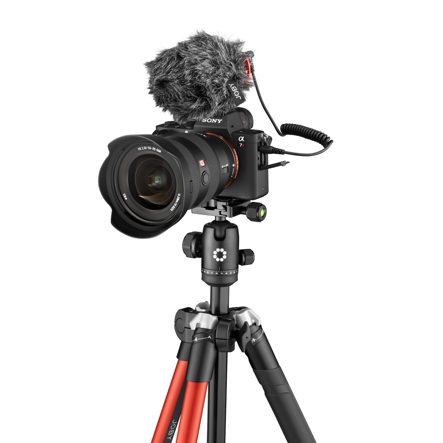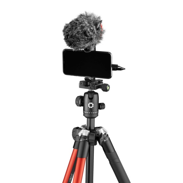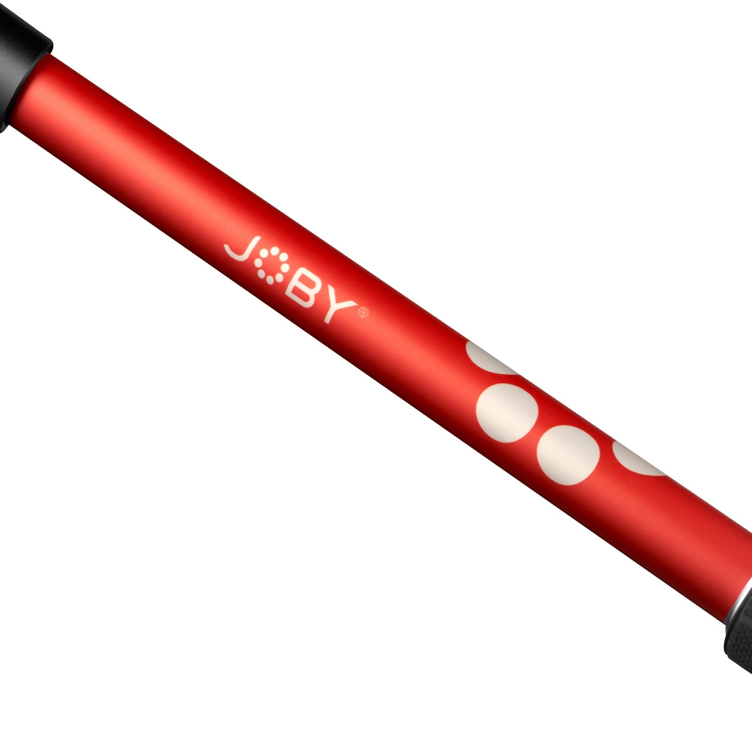 Erhältlich in Aluminiumrot und Schwarz. Im Lieferumfang enthalten ist auch eine Joby-Handyhalterung mit sicherem Doppelverriegelungsmechanismus, die über zwei 1/4"-Gewinde zur Befestigung des Handys im Quer- und Hochformat verfügt. Sie unterstützt alle Smartphones mit einer Breite von 60 bis 140 mm.
