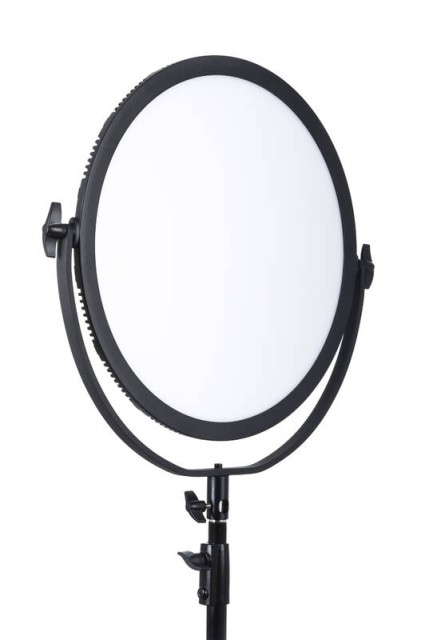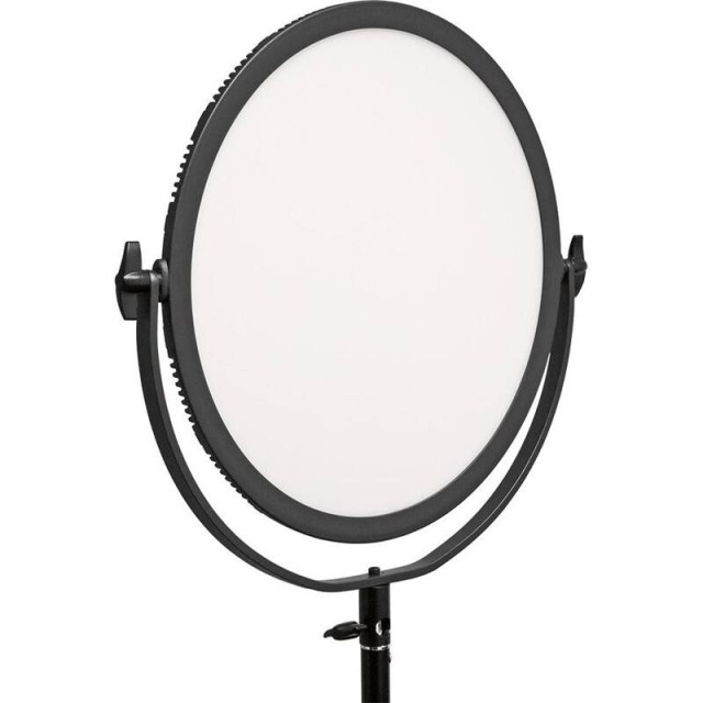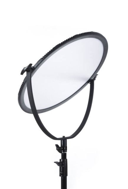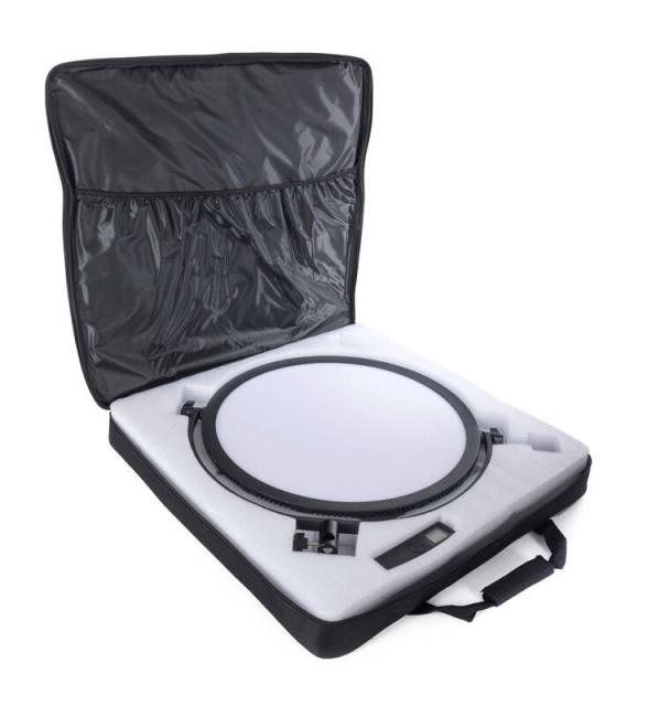 Es handelt sich um eine runde, weiche LED-Leuchte mit einem Durchmesser von 47 cm, die für Foto- und Videoarbeiten geeignet ist. Es hat eine Leistung von 70W und eine Intensität von 1800 lx/m mit 360 LED-Lampen. Die Lichtintensität kann von 0% bis 100% in 1%-Schritten eingestellt werden. Die Farbtemperatur kann in 100-K-Schritten von 3200 K bis 5600 K eingestellt werden. Die Leuchte wird mit einer Fernbedienung und einem Netzadapter geliefert und kann entweder mit 2 Sony NP-F970-Batterien oder einer V-Mount-Batterie betrieben werden. Die Leuchte verfügt über ein übersichtliches Display, das die aktuellen Einstellungen von Helligkeit, Farbtemperatur und Batteriestatus anzeigt. Im Lieferumfang enthalten ist auch ein Stativadapter für die einfache Montage.