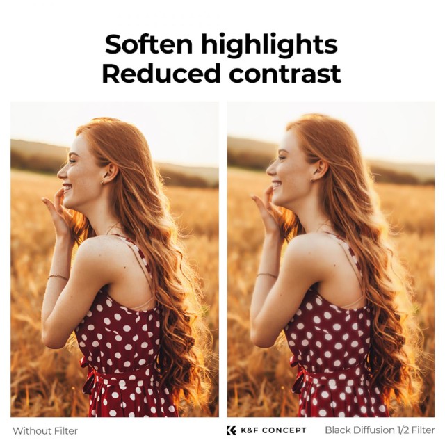 Der K&F Concept 100×100 mm Black Mist 1/2 Square Filter erzeugt einen weichen, verträumten Kino-Look, indem er Glanzlichter sanft streut und Hauttöne glättet. Er besteht aus hochwertigem AGC-Optikglas mit fortschrittlichen Mehrschichtbeschichtungen und eignet sich ideal für die Porträtfotografie und Videoproduktion.