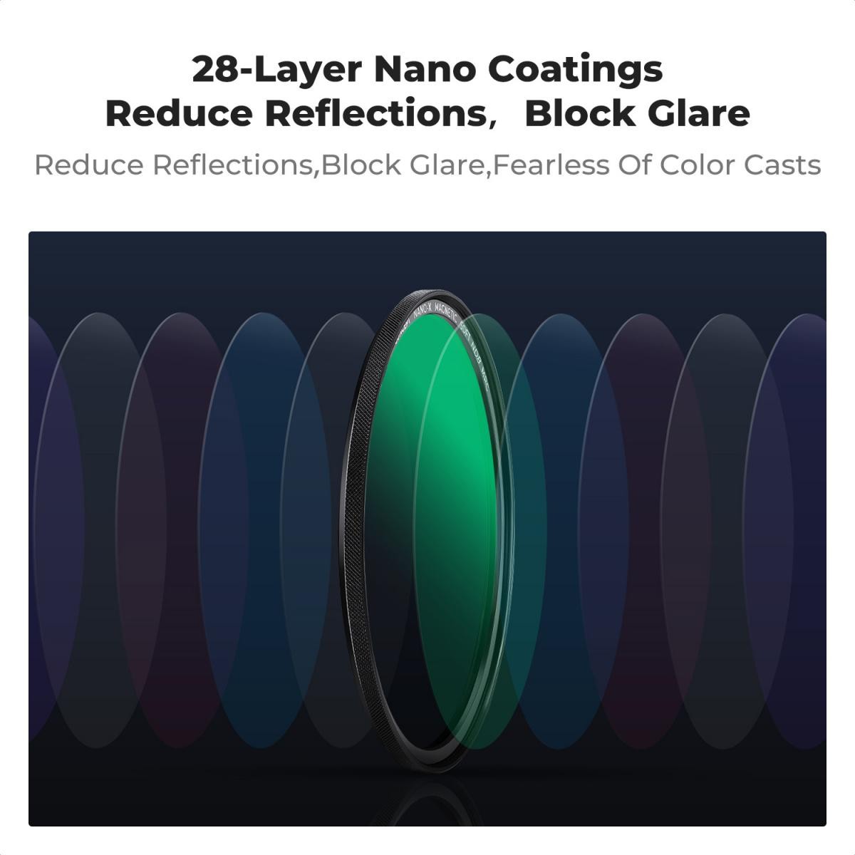 Alle Filter bestehen aus importiertem AGC-Hochauflösungsglas mit 28-facher Nano-/Mehrfachbeschichtung, wodurch sie wasserdicht, kratzfest, ölbeständig und farbgenau sind. Der ultraschlanke, CNC-gefräste Rahmen (1,9–3,33 mm) verhindert Vignettierung bei Weitwinkelobjektiven und gewährleistet gleichzeitig eine einfache Montage und Demontage. Eine kompakte Filtertasche für Transport und Schutz ist im Lieferumfang enthalten.