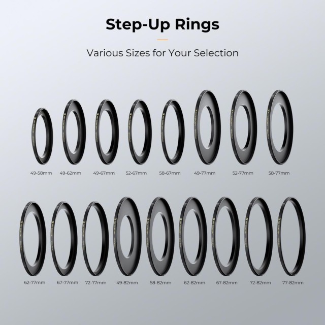 K&F 49-77mm Step Up Filter Adapterring aus Messing. Kompatibel mit allen 49-mm-Objektiven und 77-mm-Zubehör (wie Filter, Gegenlichtblenden, Blitzgeräte und Objektivkonverter). Ihre Objektivgewindegröße ist unter dem Objektivdeckel aufgedruckt oder irgendwo auf dem Objektivtubus angegeben. Klassisches Design, CNC-geformt aus haltbarem und flexiblem Messing für reibungslose Installation und dauerhaften Gebrauch. Der Zweck ist, den Durchmesser des Objektivs zu erhöhen, Kosten zu sparen.