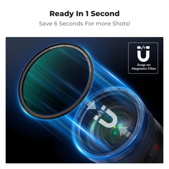 Das K&F Concept 49 mm Magnetfilter-Set mit 5 Teilen wurde für Fotografen und Videografen entwickelt, die Geschwindigkeit, Komfort und professionelle Ergebnisse benötigen. GND8-Filter: Gleicht hellen Himmel mit dunkleren Vordergrundbereichen aus und sorgt so für perfekt belichtete Landschaften. ND-Filter (ND8, ND64, ND1000): Reduzieren die Lichtmenge um 3, 6 und 10 Blendenstufen und ermöglichen so atemberaubende Langzeitbelichtungen, Bewegungsunschärfe und filmische Effekte unter hellen Bedingungen. Magnetischer Adapterring: Ermöglicht den Filterwechsel in nur einer Sekunde, sodass keine Schraubfilter mehr erforderlich sind und Sie flüchtige Momente mühelos festhalten können.
