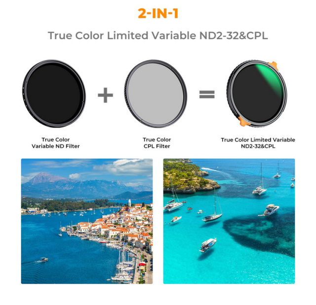 Der K&F 49MM Multifunktionsfilter True Color ND2-32 + CPL vereint die Vorteile der beiden Filter Neutrale Dichte (ND) und Zirkularpolarisator (CPL) in einem Stück und ist damit ein unverzichtbares Werkzeug zur Verbesserung Ihrer Fotografie. Dieser vielseitige Filter wurde entwickelt, um Licht zu kontrollieren, Reflexionen zu reduzieren und die Qualität der Farben in Ihren Bildern und Videos zu bewahren.