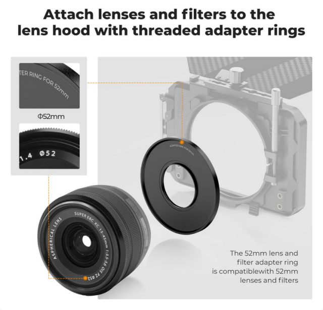 Der K&F 52MM Matte Box Adapter Ring ist eine langlebige, leichte Lösung aus einer Aluminiumlegierung in Luftfahrtqualität. Durch die CNC-Präzisionsverarbeitung sorgt er für einen sicheren Sitz der K&F Concept Matte Boxen, bietet stabilen Halt und verhindert Lichtverluste für eine verbesserte Aufnahmequalität.