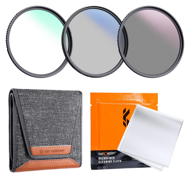 Das K&F 55mm 3pcs Professional Lens Filter Kit enthält einen UV-Filter, einen CPL-Polarisator und einen ND4-Filter, die alle aus hochwertigem optischen Glas gefertigt sind. Es wird mit einer praktischen Filtertasche und einem Doppelkopf-Reinigungsstift für die Pflege Ihrer Ausrüstung geliefert.
