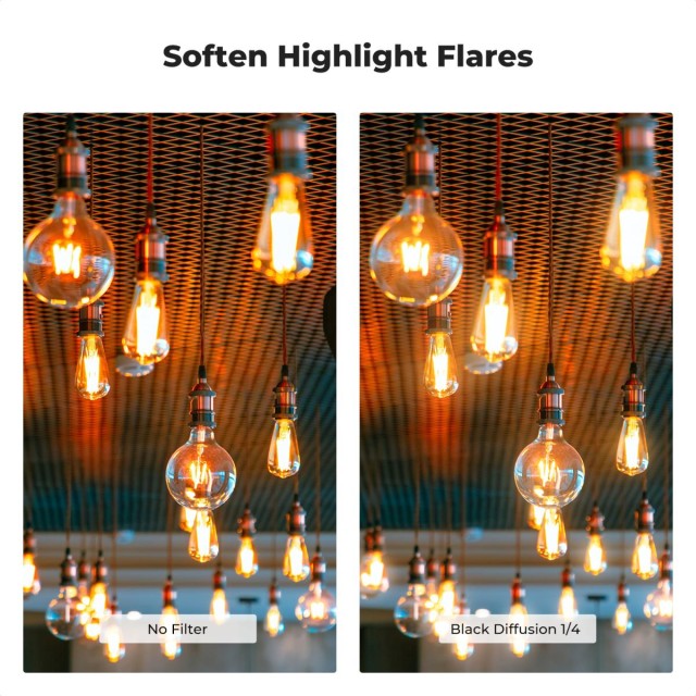 Der Black Cine Diffusion Filter besteht aus präzisem AGC-Optikglas aus Japan, das mit einer doppelten Mehrfachbeschichtung versehen ist, um die Lichtdurchlässigkeit auf bis zu 84 % zu erhöhen, Reflexionen von der glatten Oberfläche wirksam zu reduzieren und Vignettierungen oder Schatten zu vermeiden.