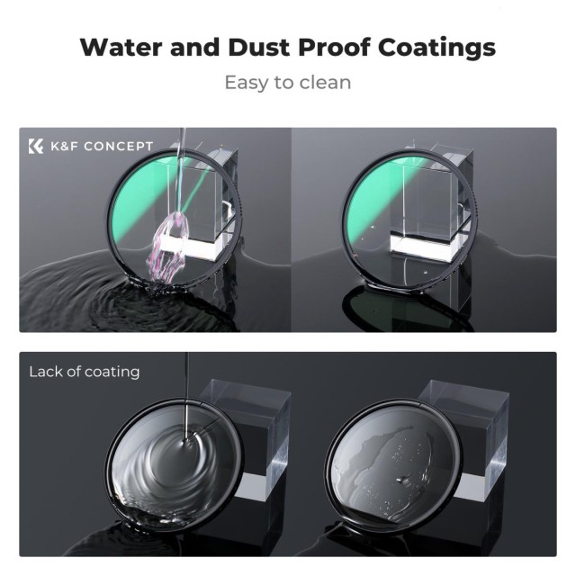 Nach dem optischen Schleifen wird der Glasfilter mit einer Hightech-Beschichtung versehen, die wasserabweisend, kratzfest und fettabweisend ist. Sie ist äußerst widerstandsfähig gegen Beschädigungen, ohne die Bildqualität zu beeinträchtigen. Selbst bei Verschmutzung durch Wassertropfen oder Öl lässt sich der Filter leicht reinigen.