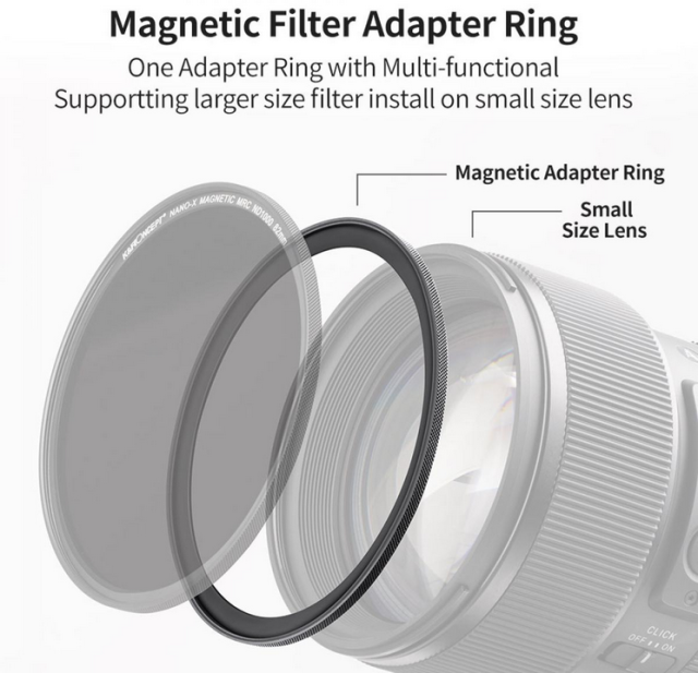 Der K&F 58-77mm Magnetic Filter Adapter Ring ermöglicht die Verwendung von größeren Filtern mit Objektiven, die kleinere Gewindegrößen haben. Der aus einer Aluminiumlegierung in Luftfahrtqualität gefertigte Adapter ist sowohl stabil als auch stoßfest. Seine schwarz eloxierte Oberfläche reduziert Reflexionen während der Aufnahme. Der Adapter bietet eine stabile Ansaugung für eine schnelle Montage und Demontage und ist mit allen magnetischen Objektivfiltern von K&F Concept kompatibel.