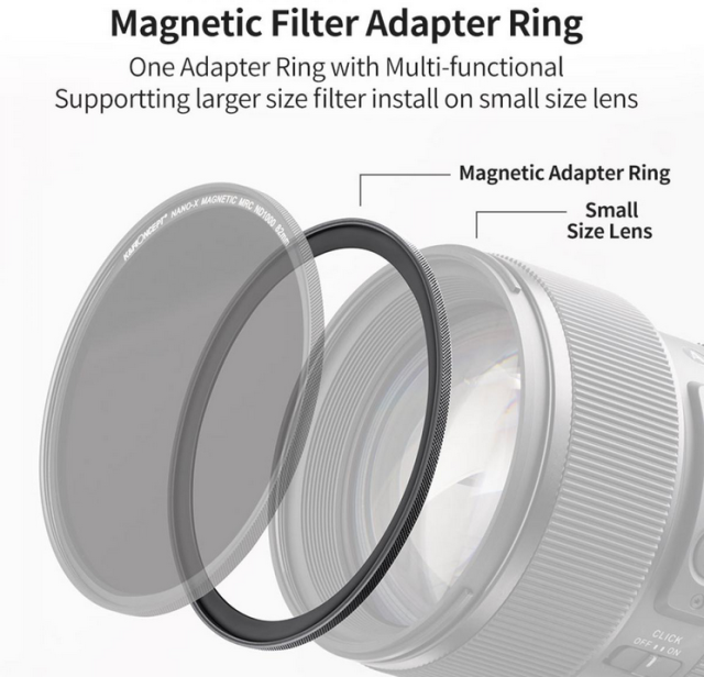 Der K&F 58-82mm Magnetic Filter Adapter Ring ermöglicht die Verwendung von größeren 82mm Filtern mit kleineren Objektiven mit 58mm Gewinde. Der aus einer Aluminiumlegierung in Luftfahrtqualität gefertigte Adapterring bietet hohe Festigkeit und Stoßfestigkeit. Seine schwarz eloxierte Oberfläche verhindert Reflexionen bei der Aufnahme. Der Adapter verfügt über eine stabile Ansaugung für eine schnelle Montage und Demontage und ist speziell für die Verwendung mit magnetischen Objektivfiltern von K&F Concept konzipiert. Bitte beachten Sie, dass dieser Adapterring nur mit 82-mm-Magnetfiltern kompatibel ist und keine nicht-magnetischen Objektivfilter unterstützt.