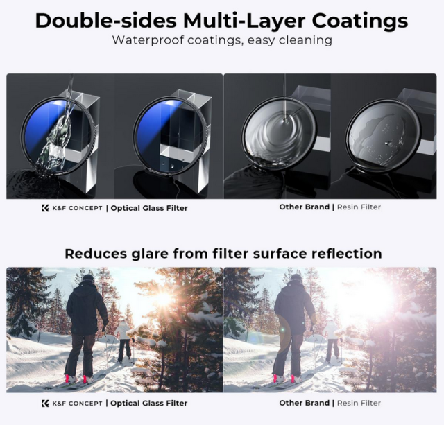 Das K&F 58mm 2pcs Professional Lens Filter Kit ist die ideale Wahl für Fotofreunde, die Qualität und Vielseitigkeit suchen. Dieses Kit enthält einen UV-Filter und einen Polarisationsfilter, die aus hochwertigem japanischem optischem Glas mit 18 Schichten fortschrittlicher Beschichtung hergestellt werden, um die Bildklarheit zu verbessern und Reflexionen zu minimieren. Der UV-Filter schützt Ihr Objektiv vor Kratzern und UV-Lichtinterferenzen und verbessert die allgemeine Bildqualität, indem er den Blaustich reduziert und die Farbgenauigkeit verbessert. Der Polfilter hilft, starke Reflexionen von nichtmetallischen Oberflächen zu beseitigen, die Farbsättigung zu erhöhen und Lichtflecken zu reduzieren. Zusätzlich enthält das Kit einen einrastenden Objektivdeckel zum Schutz vor Kratzern und Staub sowie drei Reinigungstücher und eine Filtertasche zur einfachen Aufbewahrung und Wartung.