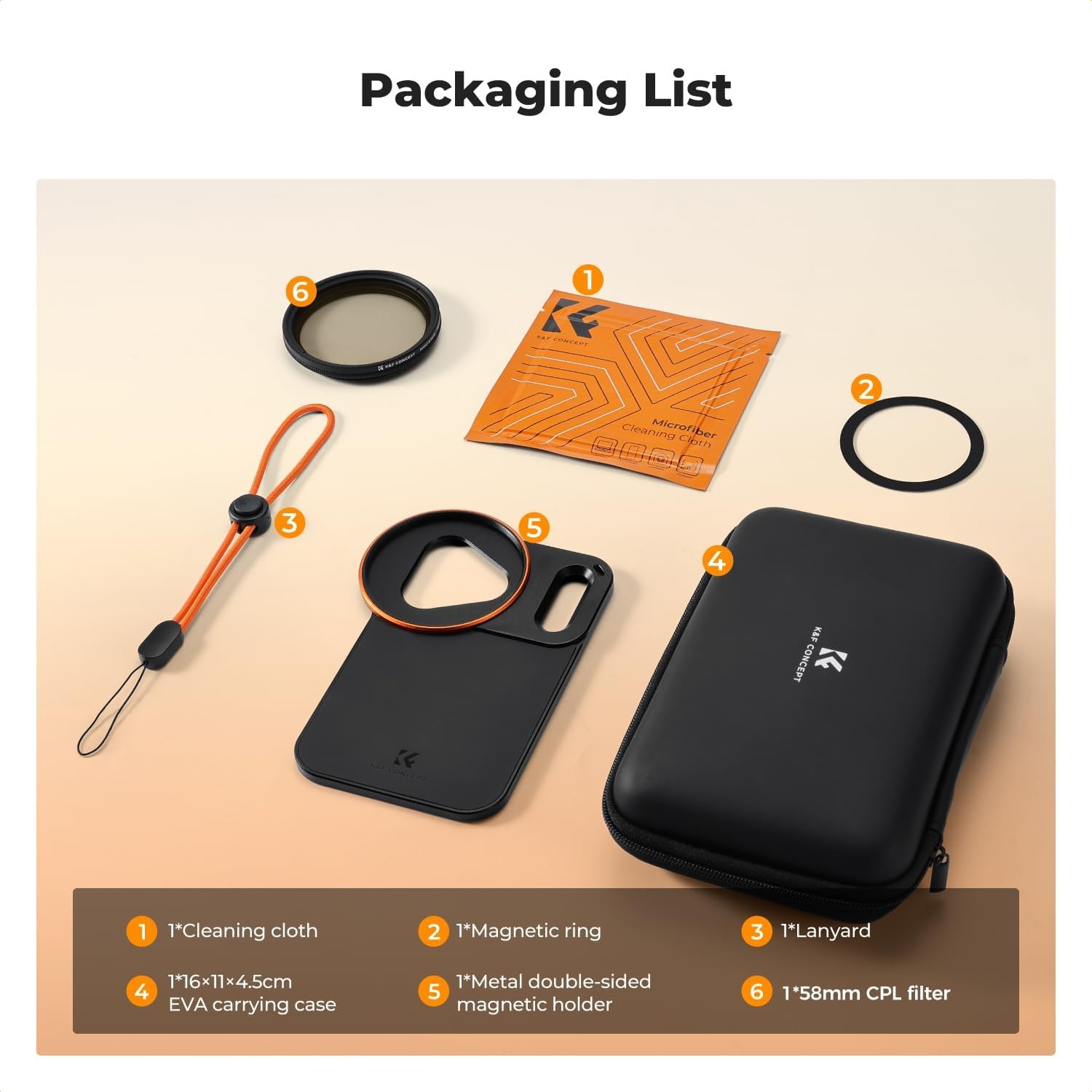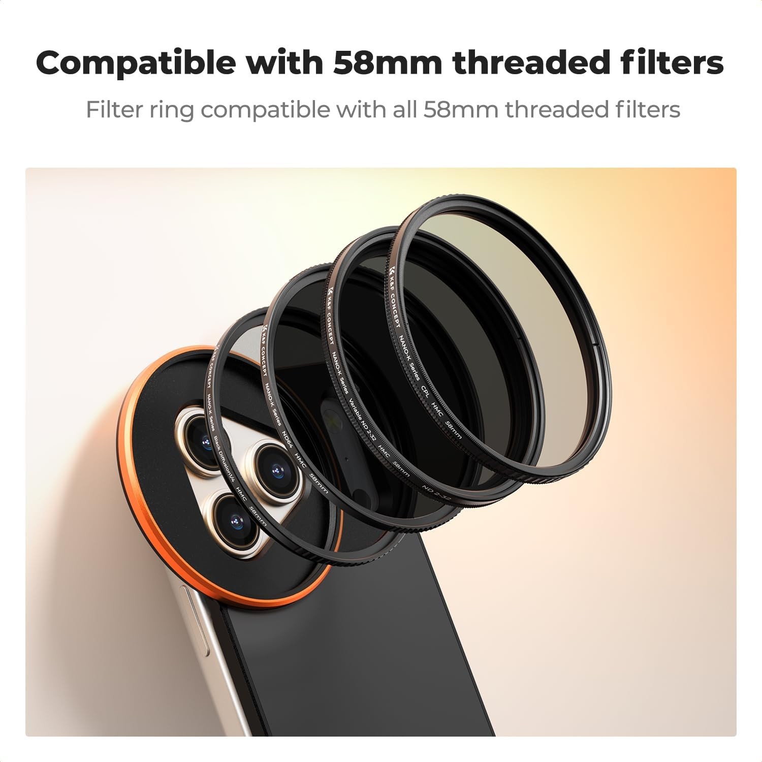 Der K&F 58 mm Schraub-Magnetfilterhalter für iPhone 17 Pro Max ermöglicht die sichere Befestigung von CPL- und anderen 58-mm-Filtern und zeichnet sich durch starke doppelseitige Magnete, präzise Passform und umfassenden Schutz für stabile und kreative mobile Fotografie aus.
