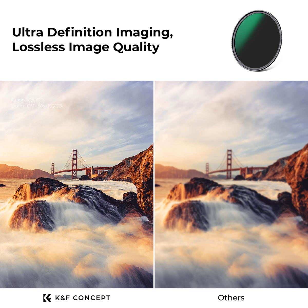 Das K&F Concept Fixed ND Filter Set bietet Fotografen eine vielseitige Lösung für verschiedene Aufnahmesituationen. Mit einer Auswahl von drei Filtern, darunter ND8 (3 Blendenstufen), ND64 (6 Blendenstufen) und ND1000 (10 Blendenstufen), eignet sich dieses Set für Porträt- und Landschaftsaufnahmen, Langzeitbelichtung und variable Lichtverhältnisse. Die aus hochwertigem japanischem optischem Glas gefertigten und beidseitig polierten Filter bieten eine hervorragende Bildschärfe und minimieren Streulicht und Reflexionen durch eine oxidierte, sandgestrahlte Oberfläche. Die 24-schichtige Nanobeschichtung sorgt für Farbneutralität, reduziert Linsenreflexionen und bietet wasser- und ölbeständige Eigenschaften, wodurch Farbstiche vermieden werden und es zu einem unverzichtbaren Werkzeug für die Landschaftsfotografie wird. Das CNC-gefertigte trapezförmige Rahmendesign verbessert die Rotationsreibung und vereinfacht die Montage und Demontage. Für zusätzlichen Komfort enthält das Kit eine wasserdichte Tasche mit einem separaten Fach, um Kratzer auf dem Filter zu vermeiden, sowie drei einzeln vakuumverpackte Reinigungstücher, die tragbar und leicht zu pflegen sind. Dieses All-in-One-Kit ist ein reisefreundlicher Begleiter des Fotografen für verschiedene Aufnahmesituationen.