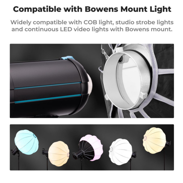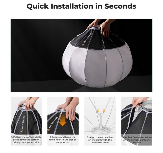 Die K&F 85CM Lantern Soft Light Box wurde für Fotografen und Filmemacher entwickelt, die vielseitige und effiziente Beleuchtungslösungen benötigen. Ihr kugelförmiges Design sorgt für 360° omnidirektionales, weiches Licht und ist damit perfekt für den Einsatz im Studio geeignet, da sie das Licht gleichmäßig mit einem Abstrahlwinkel von 270° verteilt. Diese Laternen-Softbox ist ideal, um mit einer einzigen Lichtquelle eine weiche, gleichmäßige Beleuchtung über einen großen Bereich zu erzeugen.