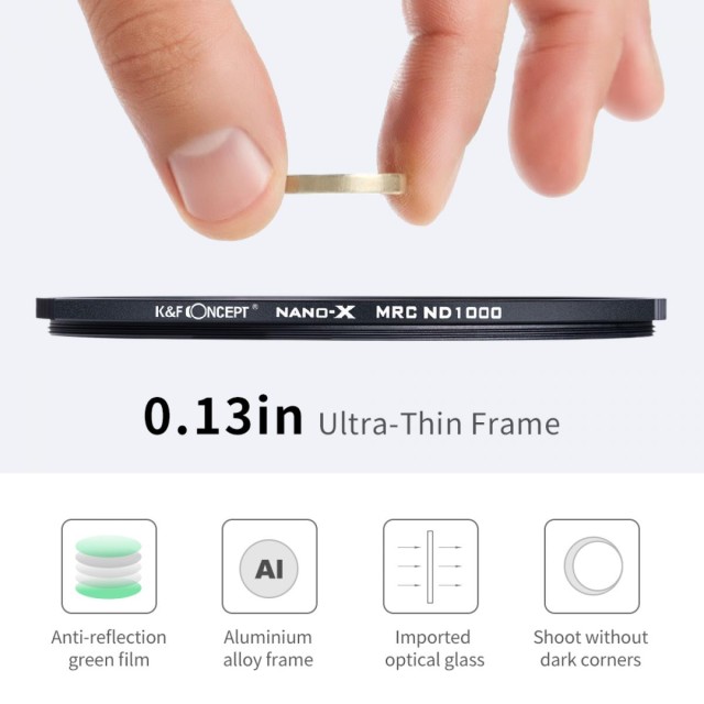 Der K&F 86MM XN26 Nano-X Fixed ND1000 Filter bietet eine echte Lichtreduzierung um 10 Blendenstufen mit hochwertigem optischem Glas, fortschrittlichen Nanobeschichtungen und einem ultraschlanken Rahmen – perfekt für die Erzeugung sanfter Langzeitbelichtungseffekte mit außergewöhnlicher Klarheit und ohne Farbstich.