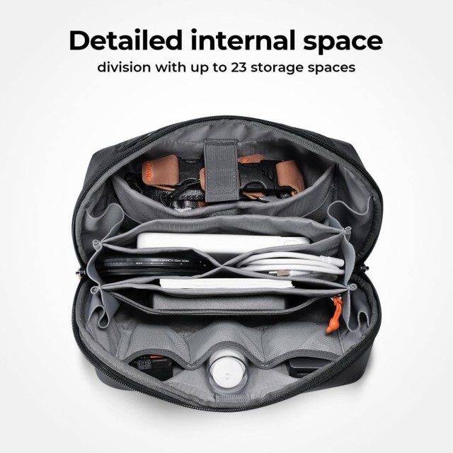 Leichtes Designkonzept mit detaillierter Innenraumaufteilung und bis zu 23 Ablagemöglichkeiten. Es ist ordentlich und übersichtlich, um Handys, Ladegeräte, Datenkabel, mobilen Strom, USB-Sticks, Mäuse, Autoschlüssel, Bankkarten, etc. zu speichern.