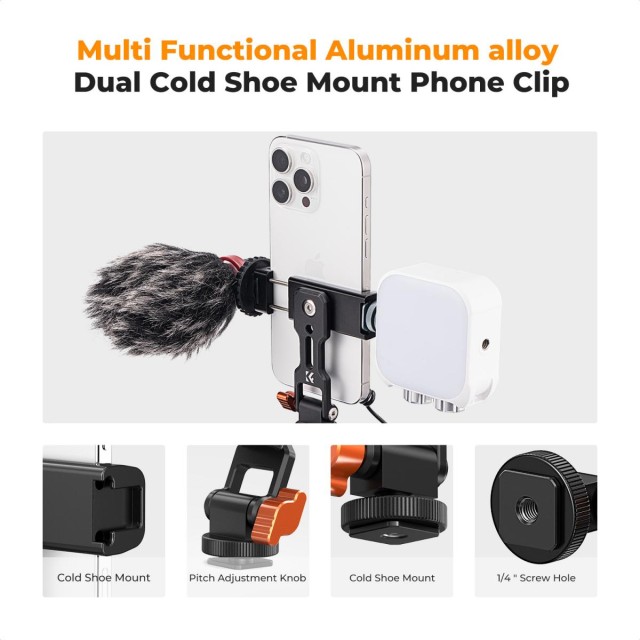 Die Handy-Stativhalterung verfügt über zwei Kaltschuhanschlüsse zum Anbringen von Mikrofonen, Aufhellern und anderem Zubehör. Darüber hinaus können die Kaltschuhanschlüsse gedreht werden, um den Winkel des Zubehörs anzupassen. Diese Handy-Halterung unterstützt Neigungswinkel von bis zu 180° und eine 360°-Rundum-Winkelverstellung und passt sich damit einer Vielzahl von Aufnahmesituationen an. Der Neigungswinkel kann auf einem Stativ oder einem Kamerakaltschuh ohne Kugelkopf eingestellt werden, was die Verwendung erleichtert.