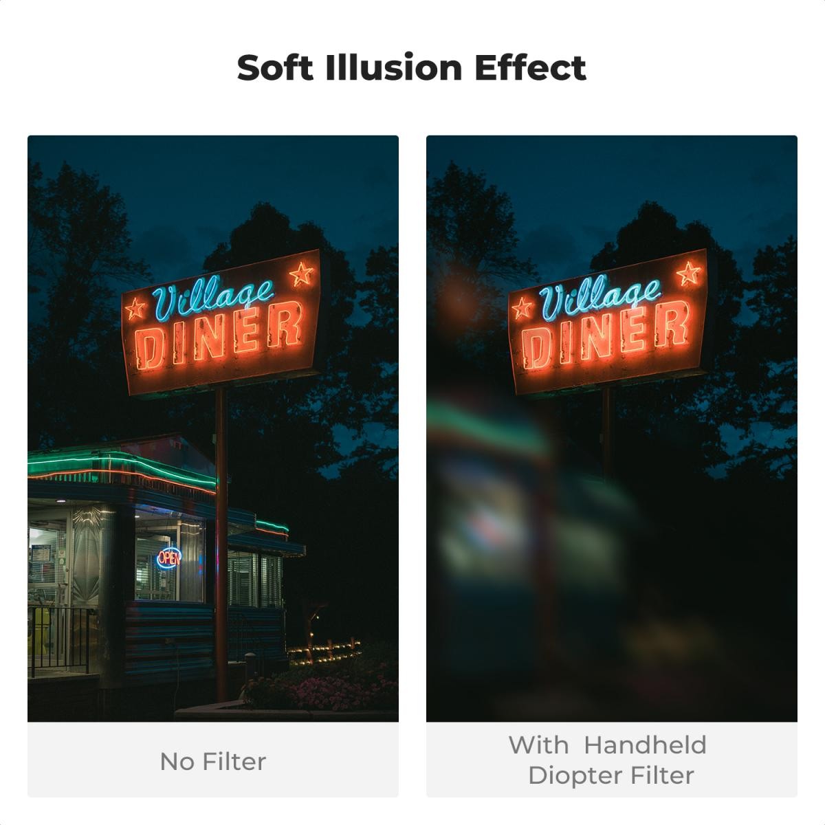 Ein Handdiopter kann den Vordergrund eines Fotos unscharf machen und so neuartige Effekte erzielen. Darüber hinaus kann er das Motiv vergrößern, um einen ähnlichen Nahaufnahmeeffekt zu erzielen. Ideal als Spezialeffektfilter für Porträt- und Stilllebenfotografen, die nach künstlerischen Verzerrungen suchen. Über den Weichzeichner hinaus vergrößert dieser Handdiopter auch das Motiv und simuliert so die Makrofotografie für den vielseitigen Einsatz sowohl in der kreativen als auch in der professionellen Fotografie.