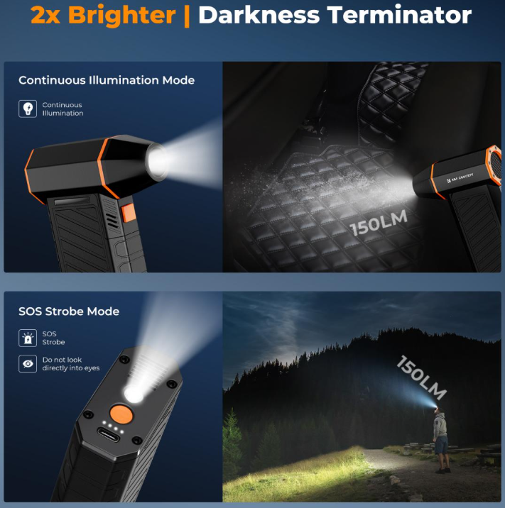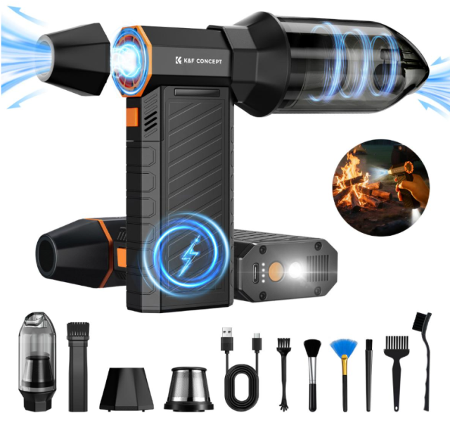 Der magnetische 2-in-1-Druckluftreiniger von K&F Concept ist ein wiederaufladbares Gerät mit bürstenlosem Motor (300.000 U/min, 150 m/s Windgeschwindigkeit, 250 G Kraft), das leistungsstarkes Blasen, Saugen und LED-Beleuchtung für die Reinigung von Computern, Tastaturen, Autos und Outdoor-Ausrüstung kombiniert. Mit magnetischen Düsenaufsätzen, 6…