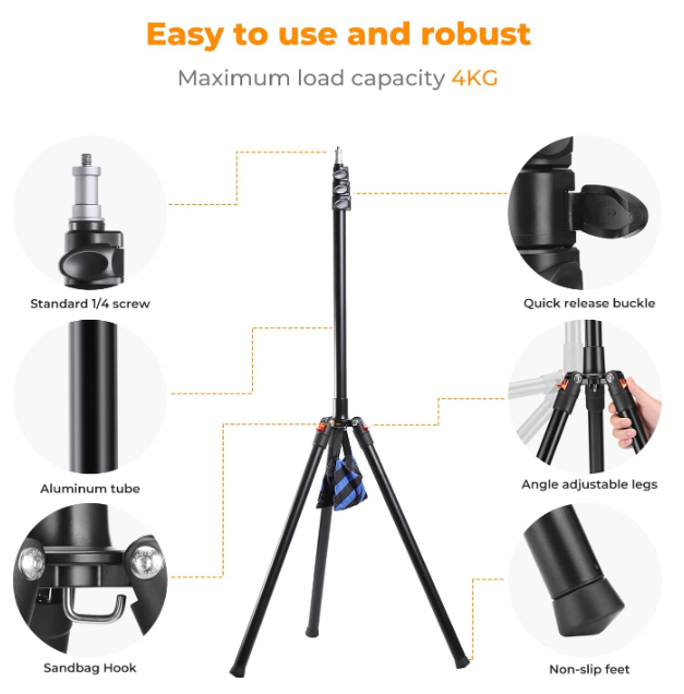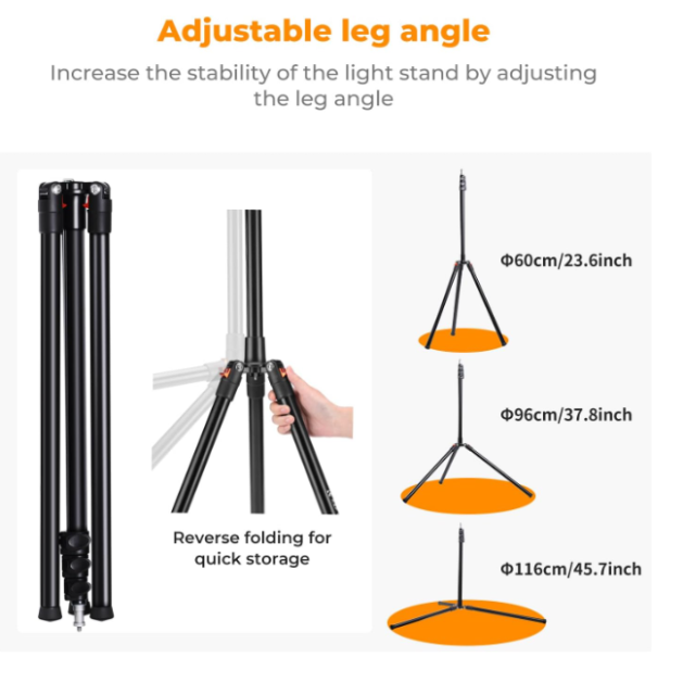 Für zusätzlichen Komfort lässt sich der Ständer vollständig umklappen, um ihn ultrakompakt zu verstauen, und wird mit einer strapazierfähigen Aufbewahrungstasche geliefert, die ihn während des Transports schützt. Ganz gleich, ob Sie in einem professionellen Studio arbeiten oder im Freien fotografieren, der K&F Concept Light Stand bietet professionelle Leistung in einem reisefreundlichen Formfaktor und beweist, dass eine robuste Halterung nicht unbedingt schweres Gerät bedeuten muss.