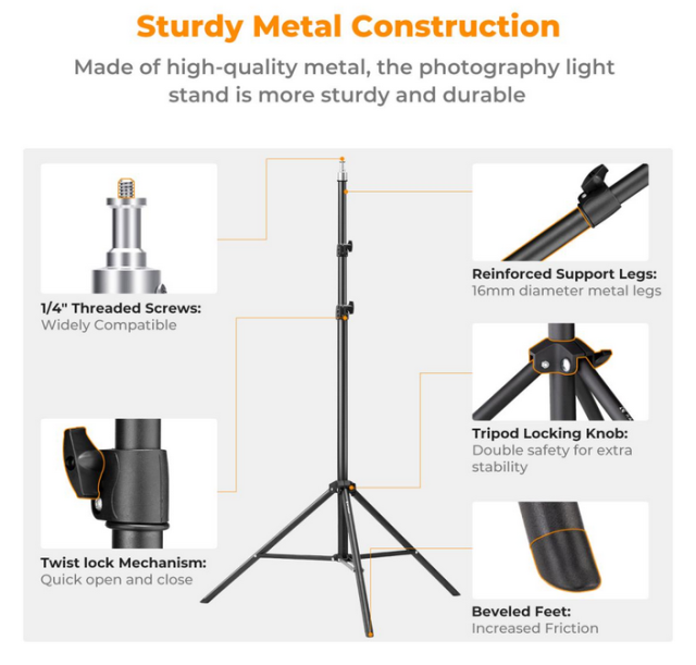 Das Stativ verfügt über eine Stativbasis mit einer Verlängerungsstange, die die Stabilität erhöht, während die klappbaren Beine und die rutschfesten Füße dafür sorgen, dass das Stativ auch auf unebenen Oberflächen stabil bleibt. Das Stativ ist von 80 cm bis 200 cm höhenverstellbar und eignet sich für verschiedene Aufnahmeszenarien und bietet Flexibilität bei Studio- und Außenaufnahmen.