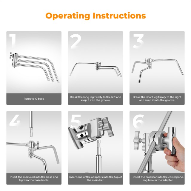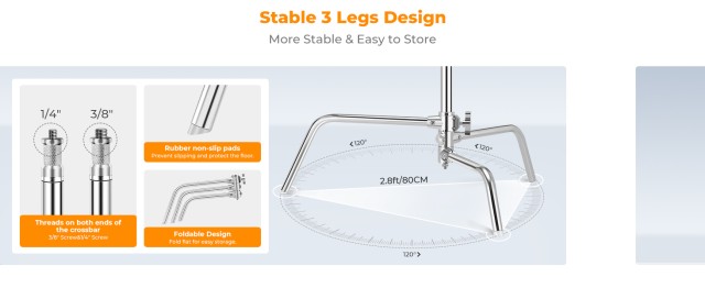 Die Enden der Querstange verfügen über 1/4"- und 3/8"-Gewinde und sind somit mit einer Vielzahl von Geräten kompatibel. Die mitgelieferten Adapter können Stangen mit unterschiedlichen Durchmessern aufnehmen, was die Vielseitigkeit erhöht. Der faltbare C-förmige Sockel mit Anti-Rutsch-Pads sorgt für ausgezeichnete Stabilität und kompakte Lagerung. Zusätzliche Sandsäcke können verwendet werden, um bei anspruchsvollen Setups für zusätzlichen Halt zu sorgen.