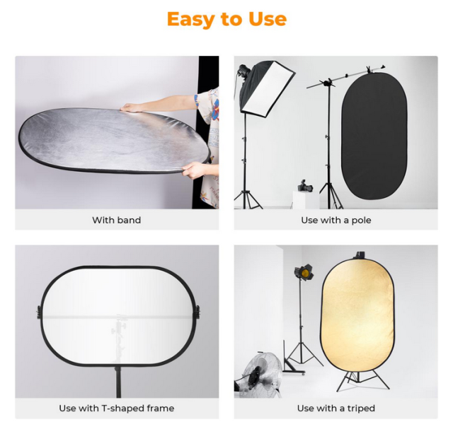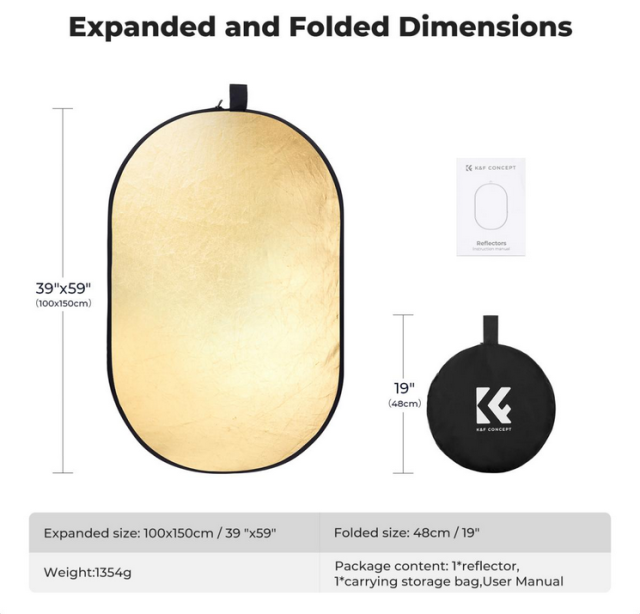 Der K&F Concept 40" x 60" (100x150cm) 5-in-1 Oval Foldable Reflector bietet vielseitige Beleuchtungsmöglichkeiten mit fünf Farbbeschichtungen: gold, silber, weiß, schwarz und durchscheinend. Er ist ideal für Fotografen, die viel unterwegs sind. Er lässt sich leicht zusammenfalten und wird mit einer Tragetasche geliefert, die das Reisen erleichtert.