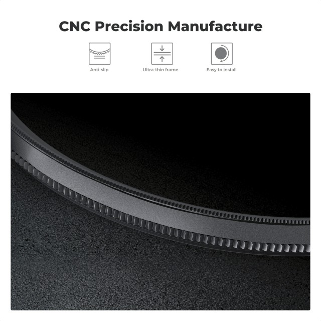 Das Black Mist-Element mildert harte Lichter, glättet Hauttöne und reduziert das Erscheinungsbild von Poren und Falten, wodurch ein natürlicher, filmähnlicher Look entsteht, der sich perfekt für Porträts, Mode und kinoreife Videos eignet. Gleichzeitig reduziert der integrierte CPL Reflexionen auf Glas-, Wasser- und Metalloberflächen und erhöht gleichzeitig die Farbsättigung und den Kontrast. Der Filter besteht aus hochwertigem AGC-Optikglas und verfügt über 18 Schichten einer verbesserten Antireflex-Nanobeschichtung für überragende Klarheit, reduzierte Blendung und zuverlässige Wetterbeständigkeit – einschließlich Schutz vor Beschlagen, Wasser und Kratzern. Der leichte, ultraschlanke Rahmen aus Flugzeugaluminium verhindert Vignettierung bei Weitwinkelobjektiven, und sein CNC-gefrästes Trapezmuster erhöht die Griffigkeit für einfaches Drehen und Anbringen. Die oxidierte, sandgestrahlte Oberfläche minimiert außerdem Streulicht und sorgt für optimale Bildqualität in jeder Aufnahmesituation.