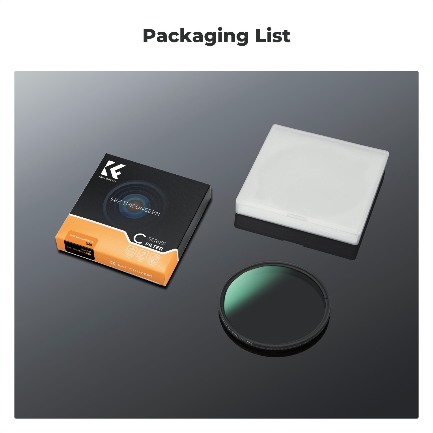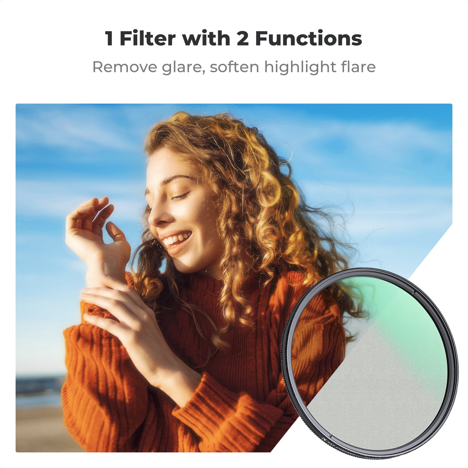 Der K&F Concept 43 mm Multifunktionsfilter Black Mist 1/4 + CPL ist ein kompakter Hybridfilter für Kreative, die sowohl eine filmische Weichzeichnung als auch eine Blendreduzierung in einer praktischen Lösung benötigen. Dieser fortschrittliche 2-in-1-Filter kombiniert den atmosphärischen Glanz eines Black Mist 1/4-Diffusionsfilters mit der Klarheit und Reflexionskontrolle eines Zirkularpolarisators (CPL), sodass keine mehreren Filter mehr übereinandergelegt werden müssen.
