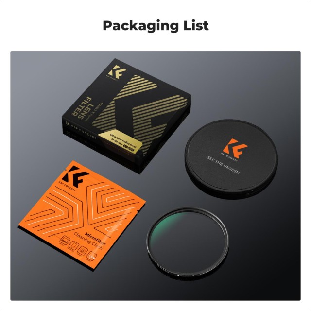 Der UV-Filter hat zwei Funktionen: Zum einen verhindert er, dass der CCD-Sensor durch UV-Strahlung beeinträchtigt wird, und schwächt den durch UV-Strahlung verursachten Blaustich in den Bildern ab, wodurch Klarheit und Farbe gewährleistet werden. Eine weitere Funktion ist der Schutz des Objektivs vor Stößen, Wasser, Staub, Kratzern, Öl und Fingerabdrücken. Der stoßfeste, gehärtete UV-Filter von KF Concept wird aus importiertem japanischem AGC-Glas hergestellt, das stoßfest, wasserdicht und kratzfest ist.