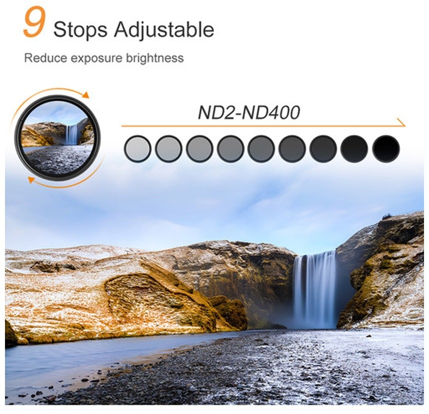 Der K&F CONCEPT 46 mm True Color Variable ND Filter (ND2–ND400) ist ein ultradünner, einstellbarer Neutraldichtefilter für präzise Lichtsteuerung. Er besteht aus hochwertigem optischem Glas und verfügt über eine Antireflexbeschichtung. Damit sorgt er für naturgetreue Farben und gleichmäßige Belichtungsanpassungen bei Foto- und Videoaufnahmen.