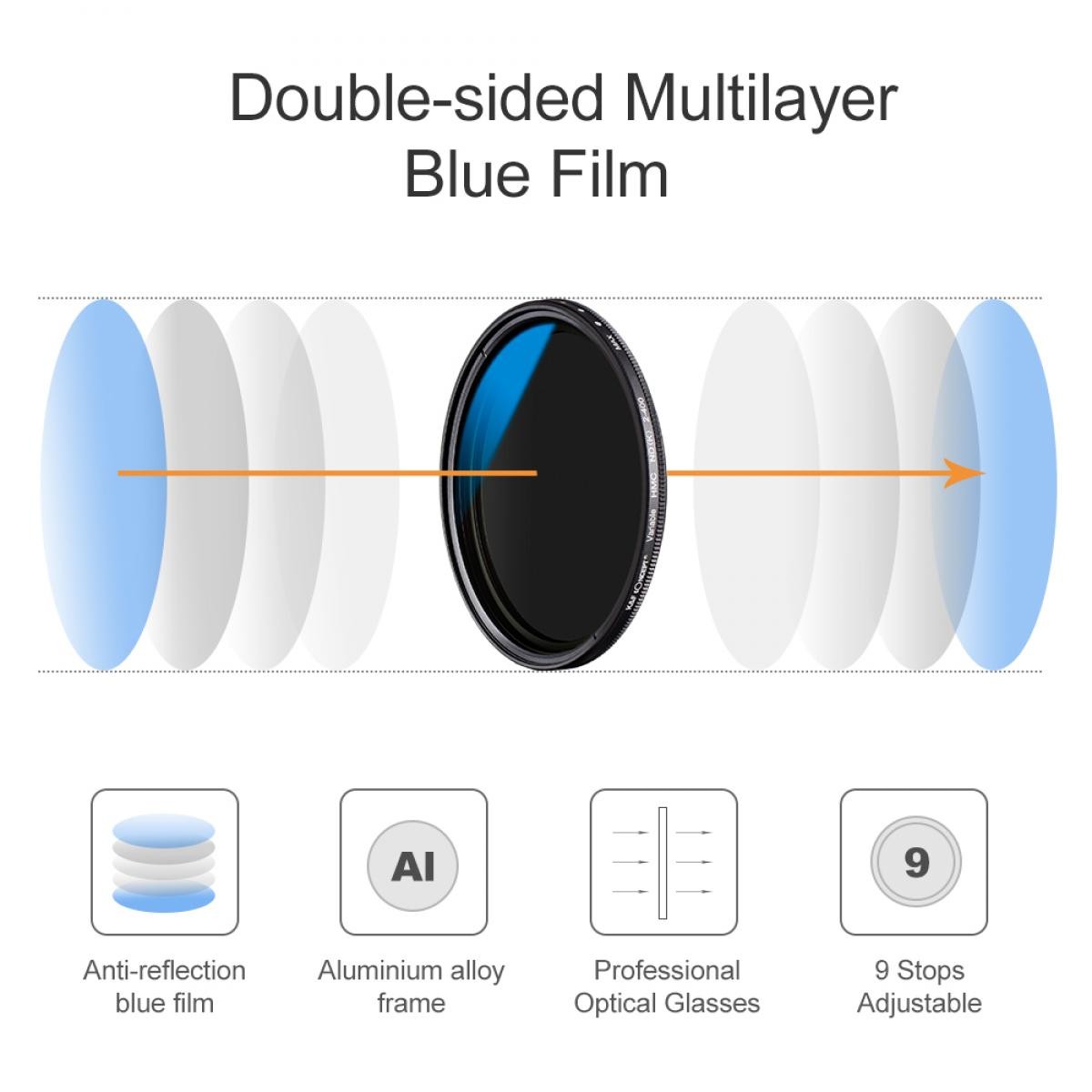Der aus hochwertigem optischem Glas gefertigte Filter bietet eine hervorragende Klarheit und minimiert optische Verzerrungen. Durch Drehen des vorderen Elements lassen sich sanfte Übergänge zwischen den ND-Stufen erzielen, wodurch mehrere feste ND-Filter ersetzt werden und eine unübertroffene Flexibilität bei Außenaufnahmen geboten wird. Der ultradünne Aluminiumrahmen verhindert Vignettierung, selbst bei Weitwinkelobjektiven, während seine robuste Konstruktion für langlebige Zuverlässigkeit sorgt. Dieser VND-Filter eignet sich ideal für Landschaftsfotografie, Porträts mit geringer Schärfentiefe, Bewegungsunschärfeeffekte, Videografie bei hellem Tageslicht und kreative Arbeiten mit langer Verschlusszeit und ist ein unverzichtbares Werkzeug für eine gleichmäßige Belichtung und künstlerische Kontrolle.