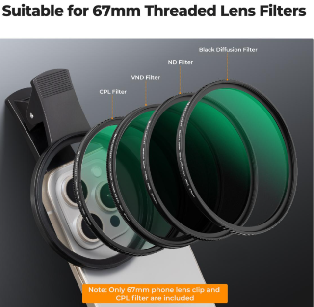 Verbessern Sie Ihre Handyfotografie mit dem K&F 67 mm Clip-on CPL-Kameraobjektivfilter-Set für Smartphones, einem universellen Zubehör, das mit jedem Smartphone-Modell kompatibel ist und gewöhnliche Aufnahmen in atemberaubende Bilder in professioneller Qualität verwandelt. Das Herzstück bildet ein hochwertiger 67-mm-CPL-Filter, der Blendeffekte von nichtmetallischen Oberflächen wie Wasser oder Glas effektiv reduziert, die Farbtiefe von Landschaften und Porträts intensiviert und den öligen Glanz auf der Haut der Motive subtil minimiert, um ein schmeichelhafteres, natürlicheres Aussehen zu erzielen – ideal für Outdoor-Abenteuer, Selfies oder alltägliche Schnappschüsse.